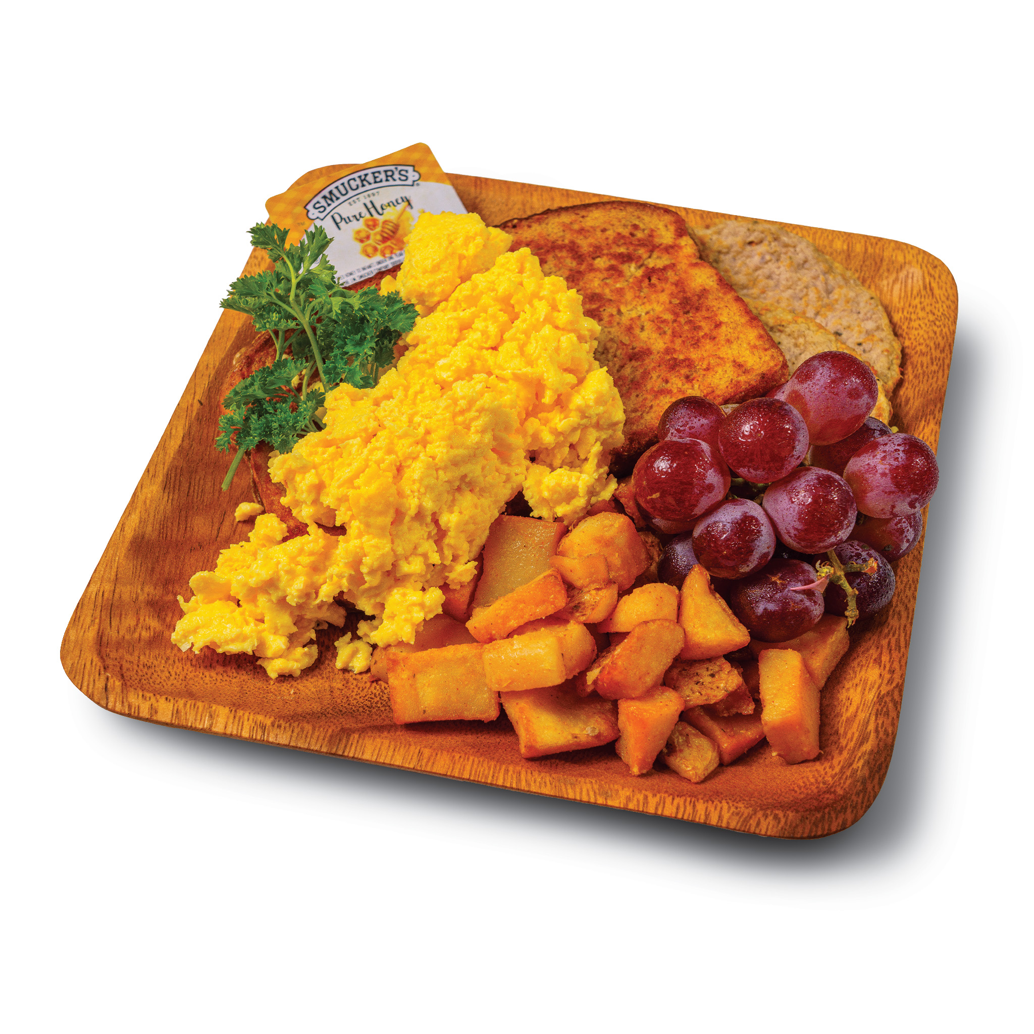Served with fluffy eggs, savory turkey sausage, and tender potatoes, this meal is balanced with a drizzle of honey, a sprinkle of cinnamon, and a hint of vanilla.
